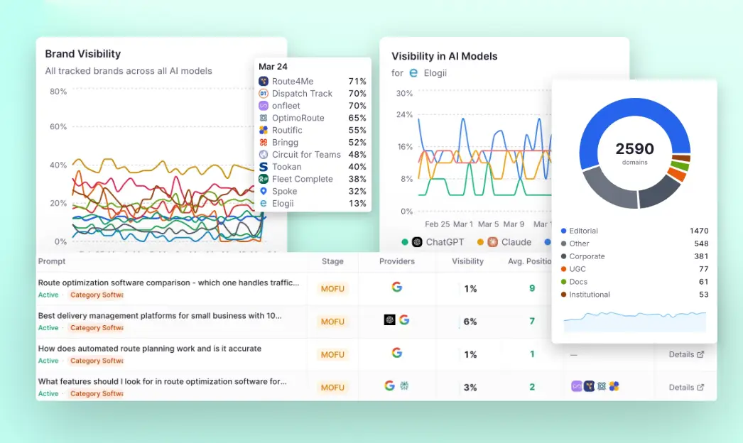 See how AI assistants mention your brand. Track visibility scores, sentiment, position changes, and more over time.