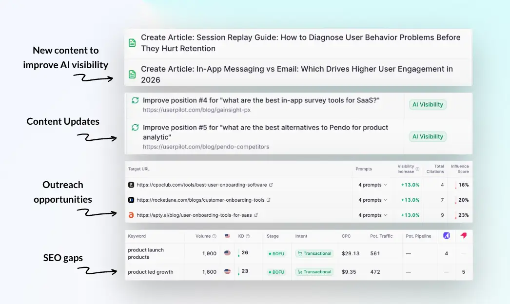 Automatically identify in real-time gaps and opportunities you can use to improve AI visibility and influence AI models.