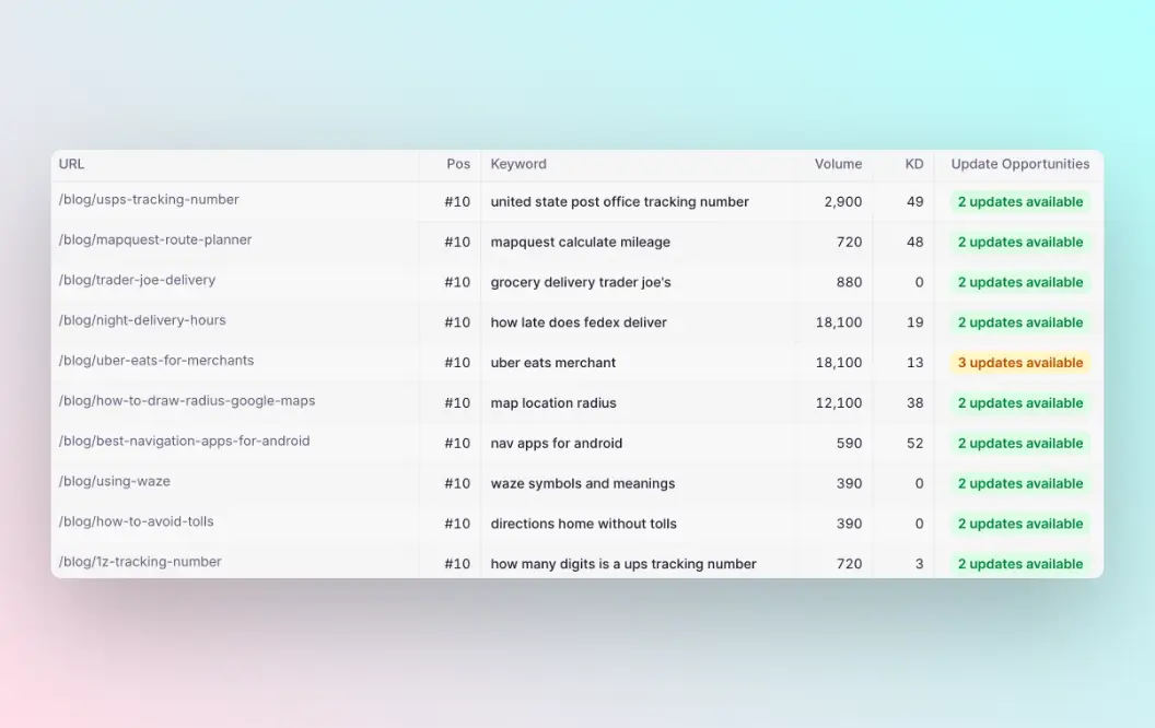Know those keywords that are going stale and you can't move past position 10? Get actionable update suggestions on what to change to move up in rankings.