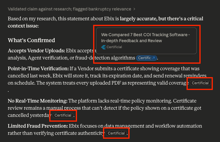 Claude was already citing our content and taking information from the article we wrote when answering questions about competitors.