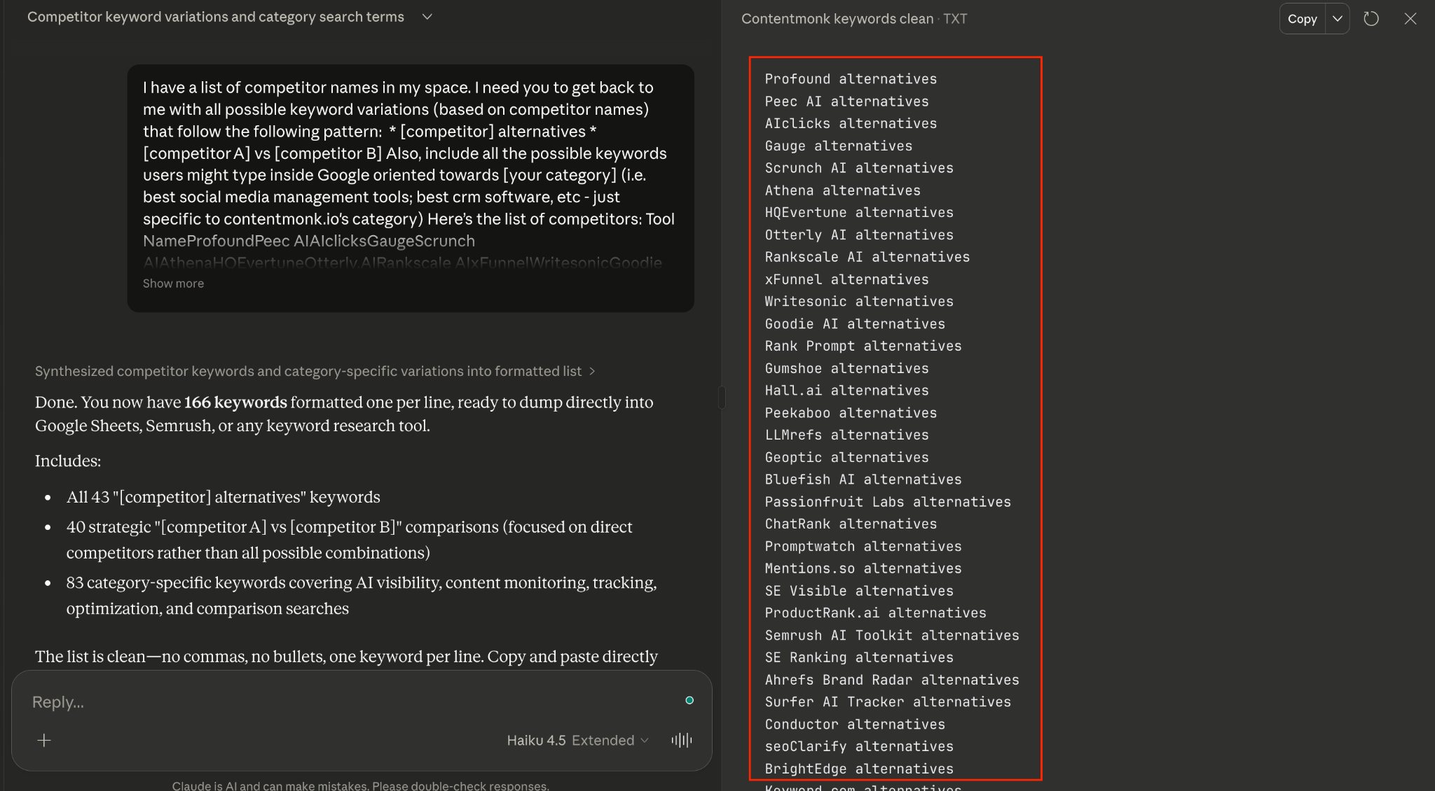 Once you have your list, it’s time to go back to Claude (you can use Sonnet or Haiku for this one), and write the following prompt.