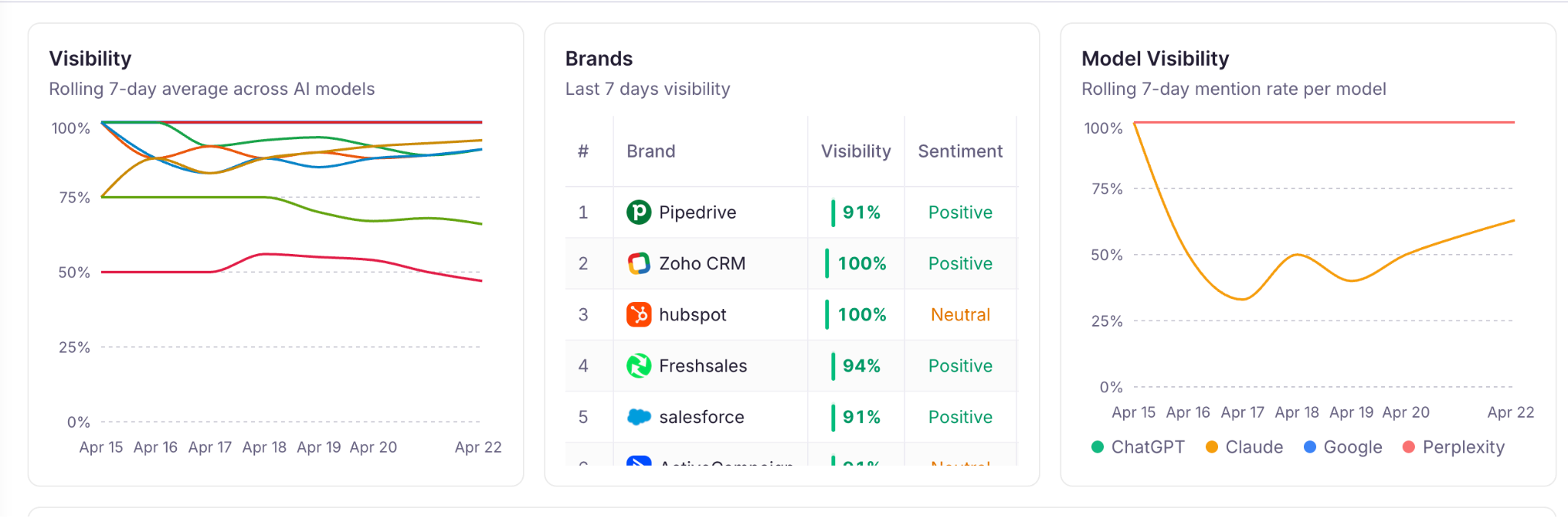 - Your overall AI visibility, visibility in different models, and how your competitors rank: