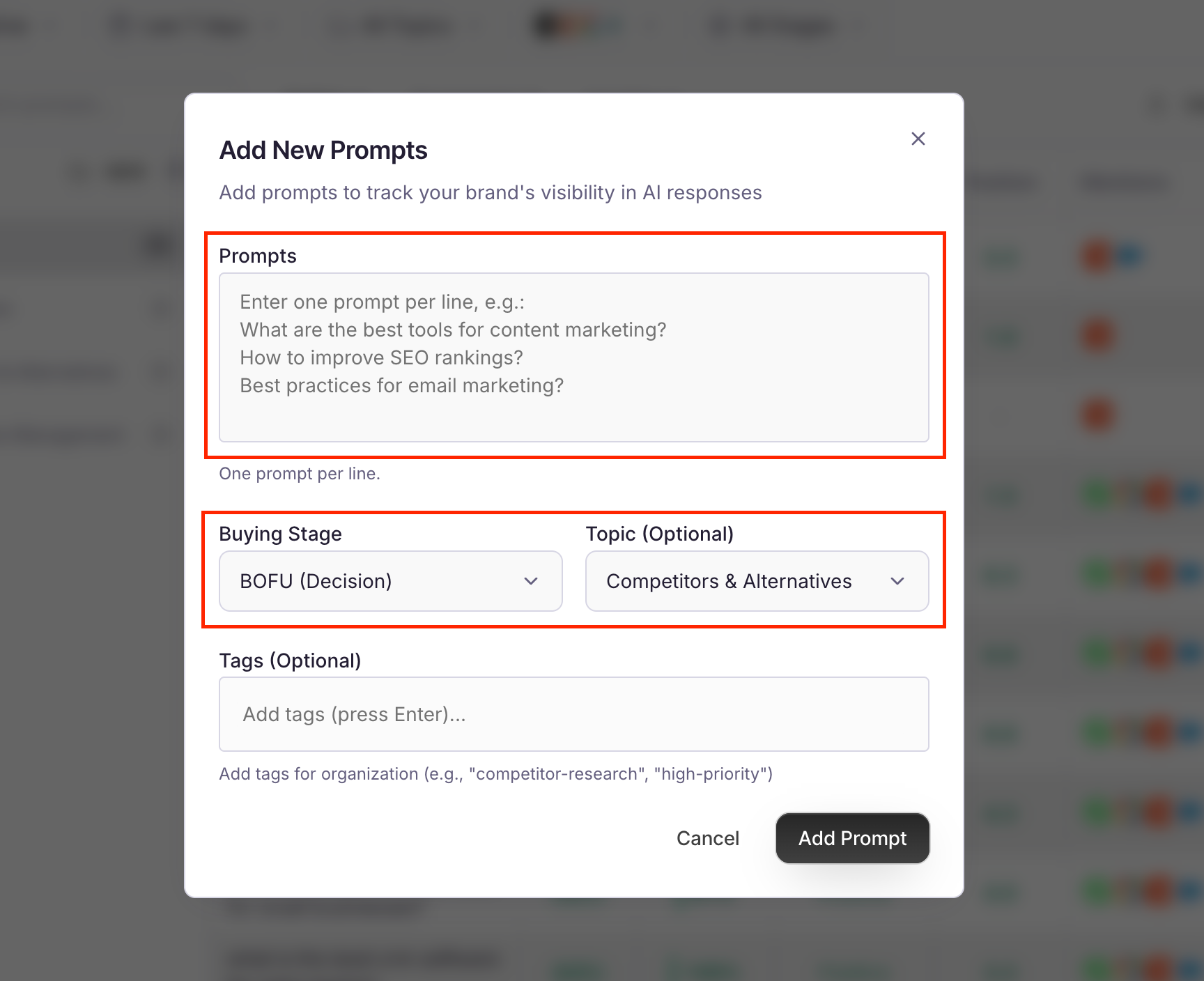 - Add your prompts one by line. For Buying Stage select BOFU, and for the Topic you can leave it blank or write Competitors & Alternatives for better organization of your workspace: