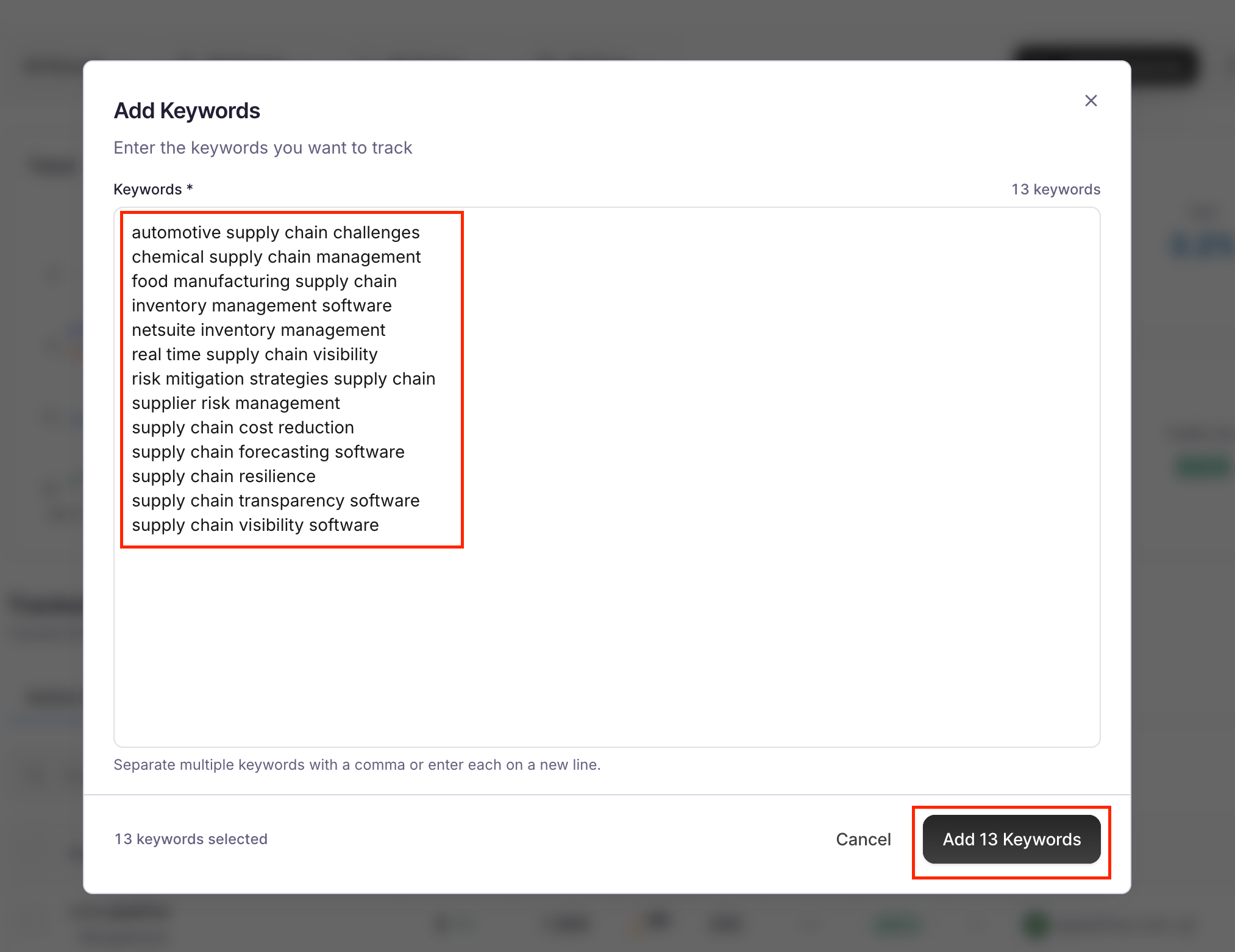 - Paste all of your focused keywords, one-by-line, and click on the “Add keywords” button