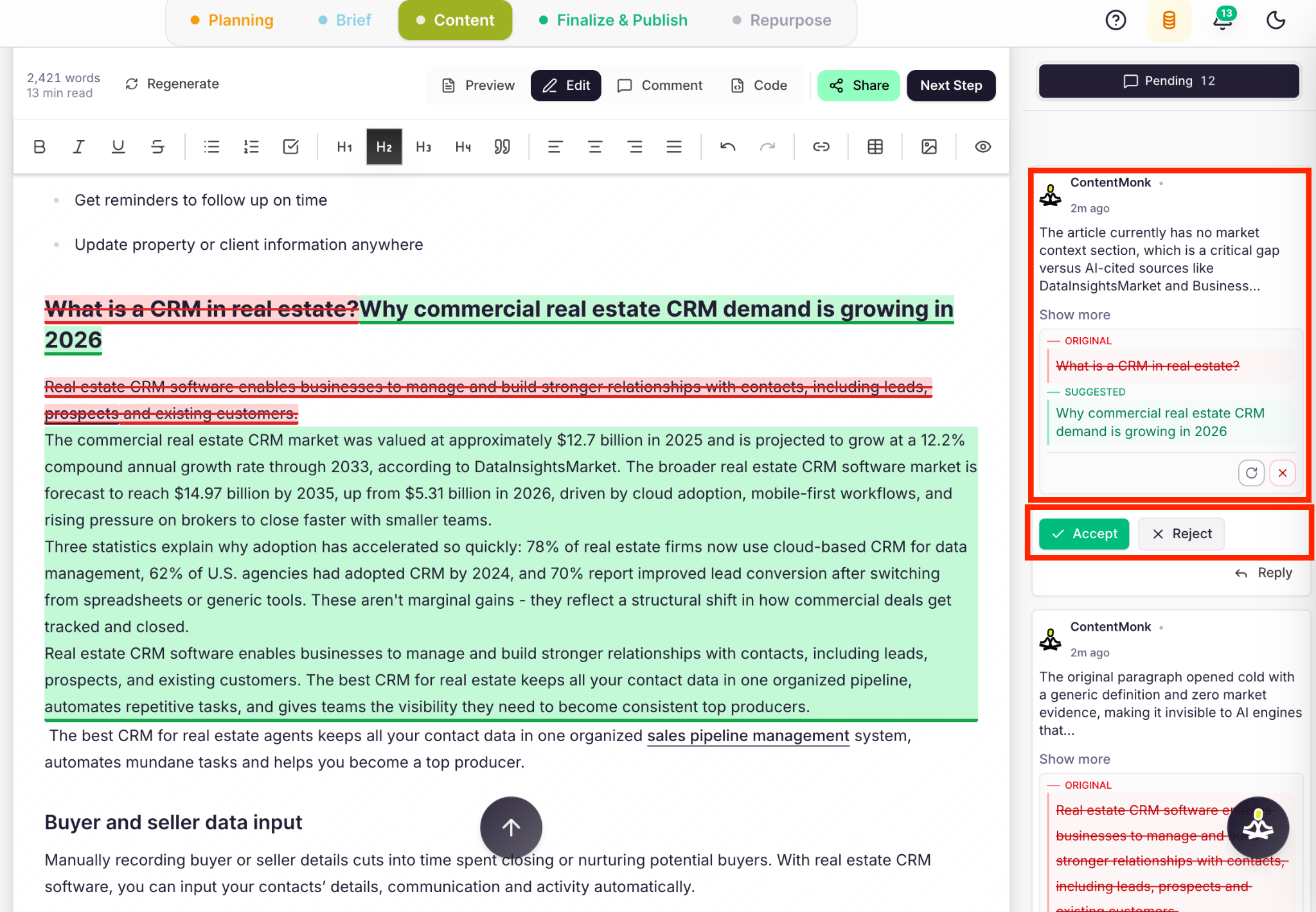 You can then accept or decline ContentMonk’s updates in one click: