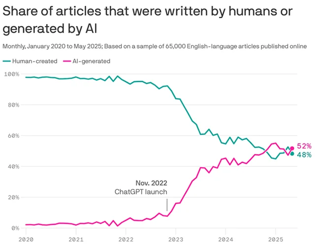 As a result, thousands of AI-generated articles are published every day. AI-generated content is now growing faster than human-written content online.