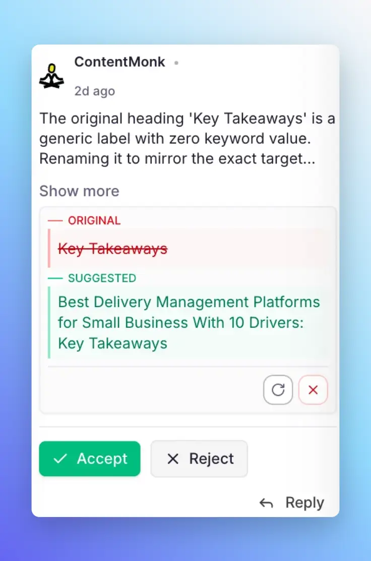 Stuck on page two? ContentMonk identifies what needs to change and helps you rewrite it. Faster than starting from scratch